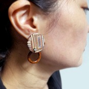 四角い柄がモダンなヴィンテージの着物素材に、ヴィンテージのルーサイト製フープが揺れる大きめイアリング。レトロとモダンが不思議と同居する一品。