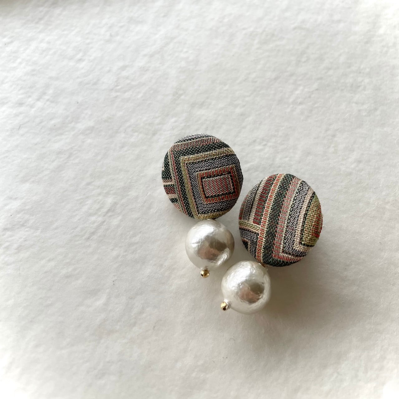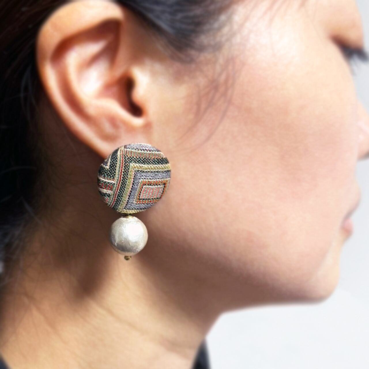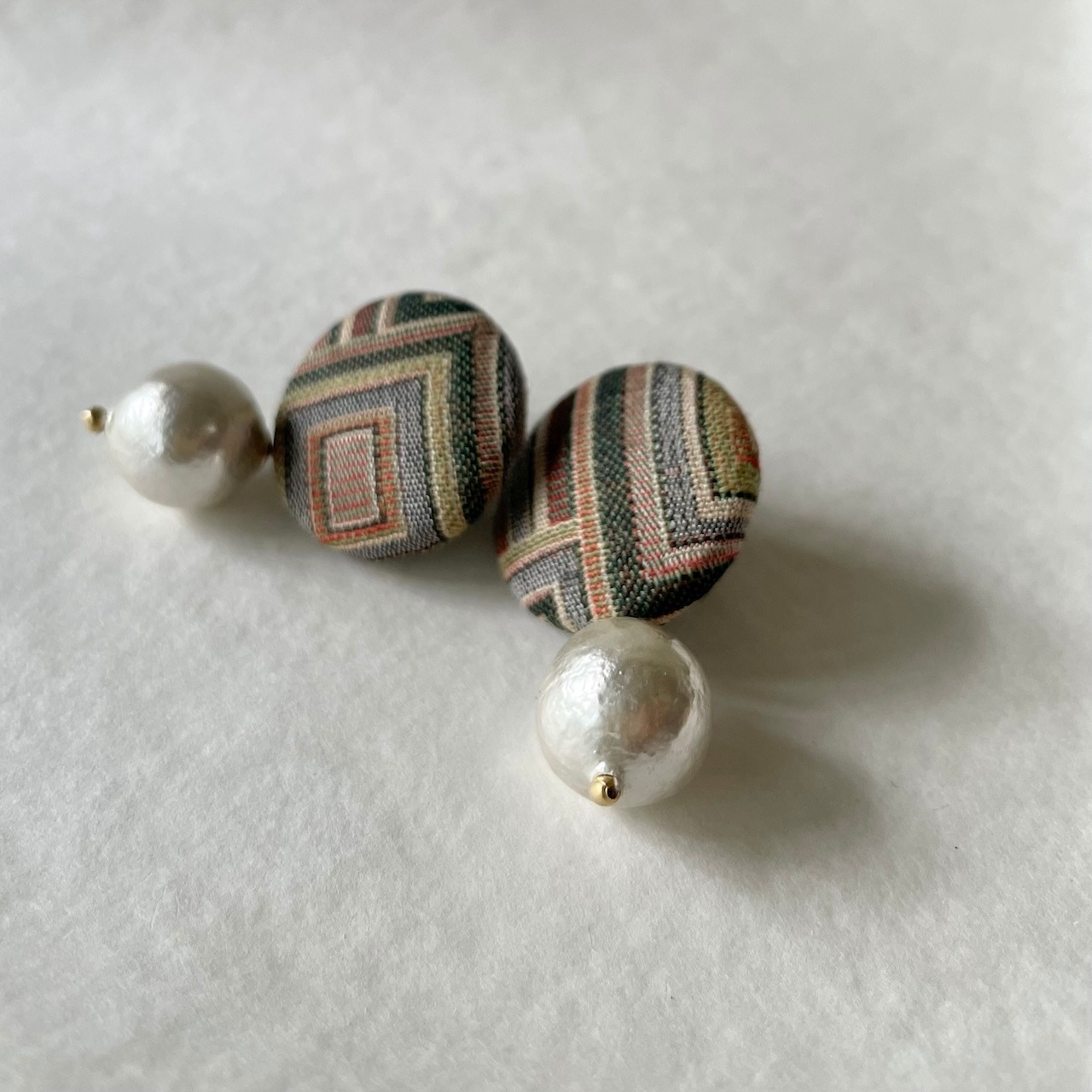 四角い柄がモダンなヴィンテージの着物素材に、ヴィンテージのペーパーパールを下げた存在感のあるピアス。