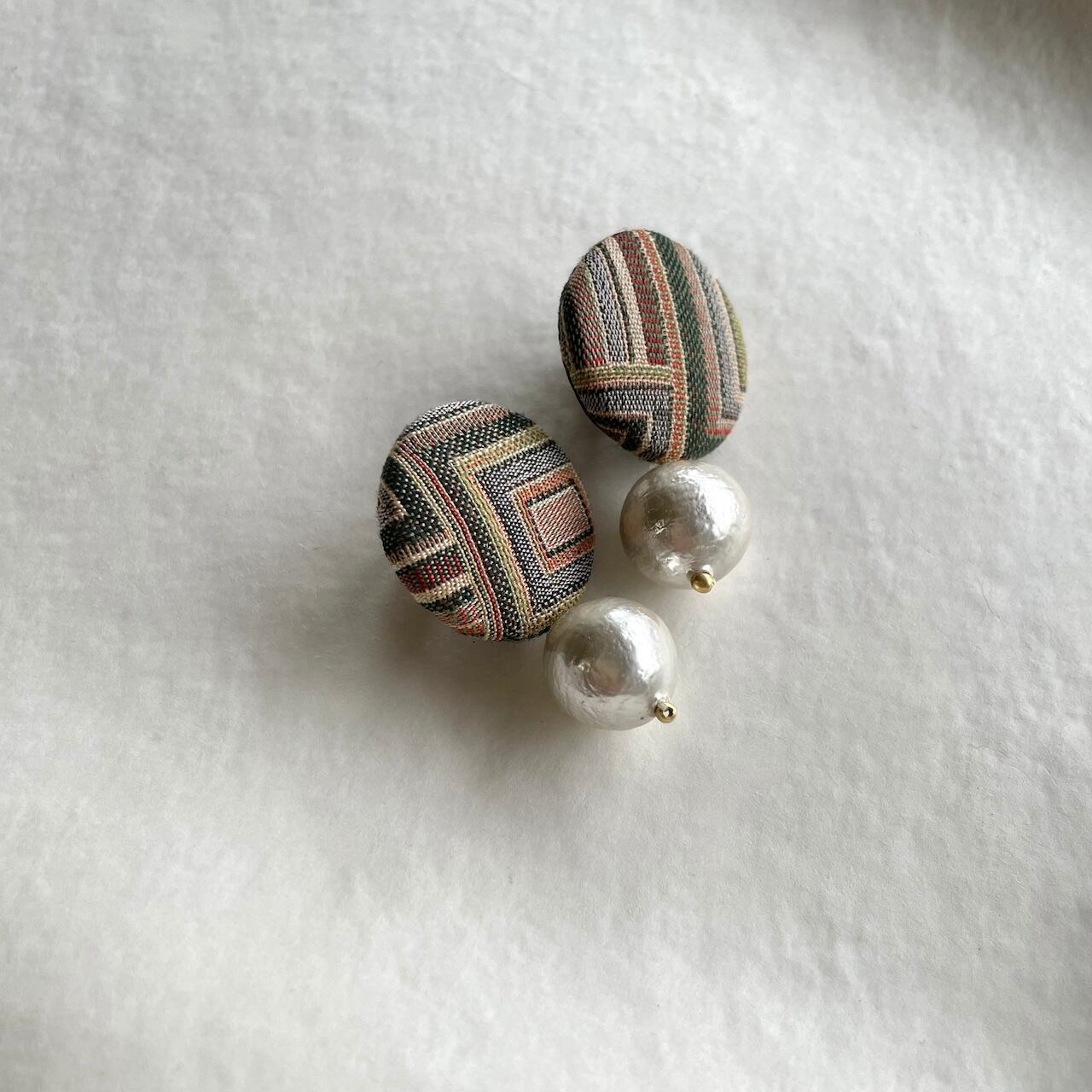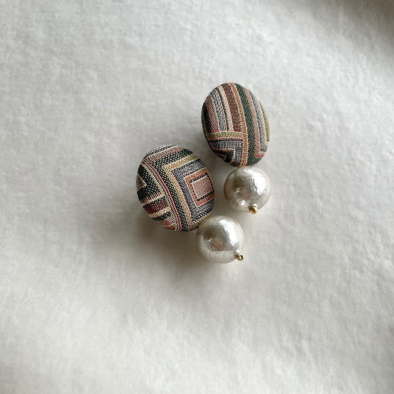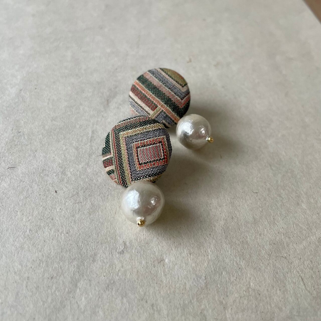 四角い柄がモダンなヴィンテージの着物素材に、ヴィンテージのペーパーパールを下げた存在感のあるピアス。