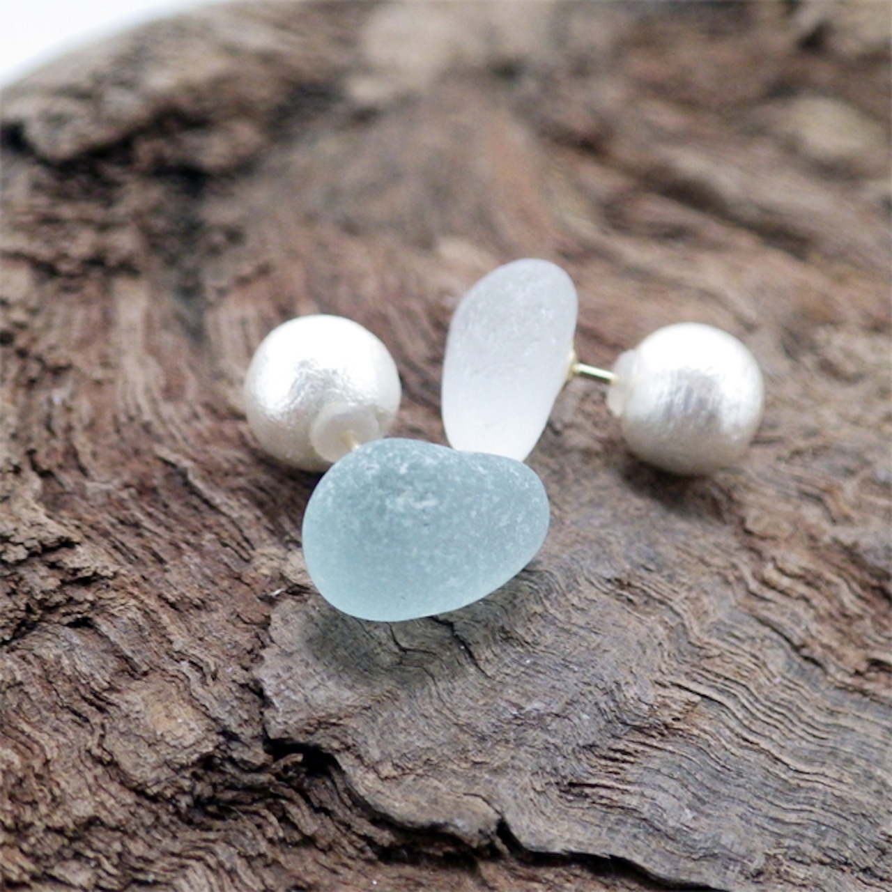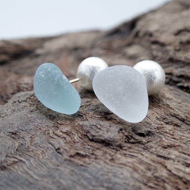 Cygnus シーグラスのスタッドピアス コットンパールキャッチ