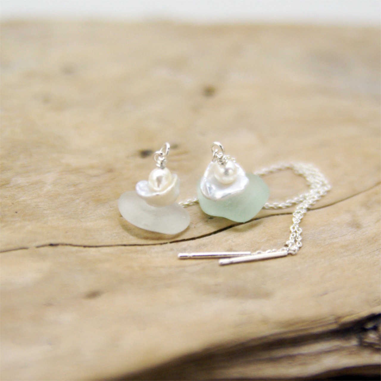 軽やかなシルバーチェーンの先に浮遊する、シーグラスとケシパール。